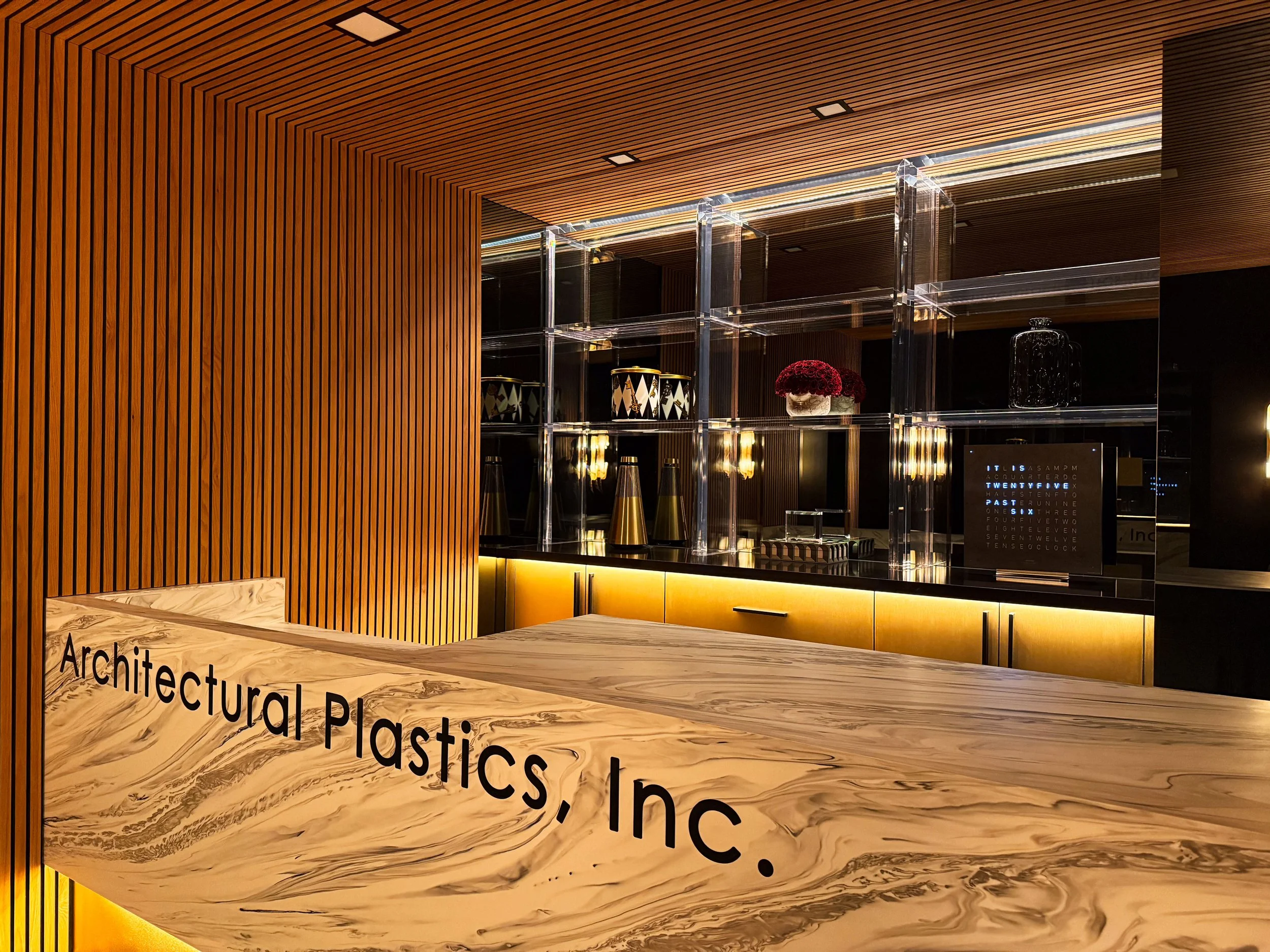 Each piece is crafted in-house using premium veneers, solid woods, and solid surface materials such as Corian, acrylic, and metal.