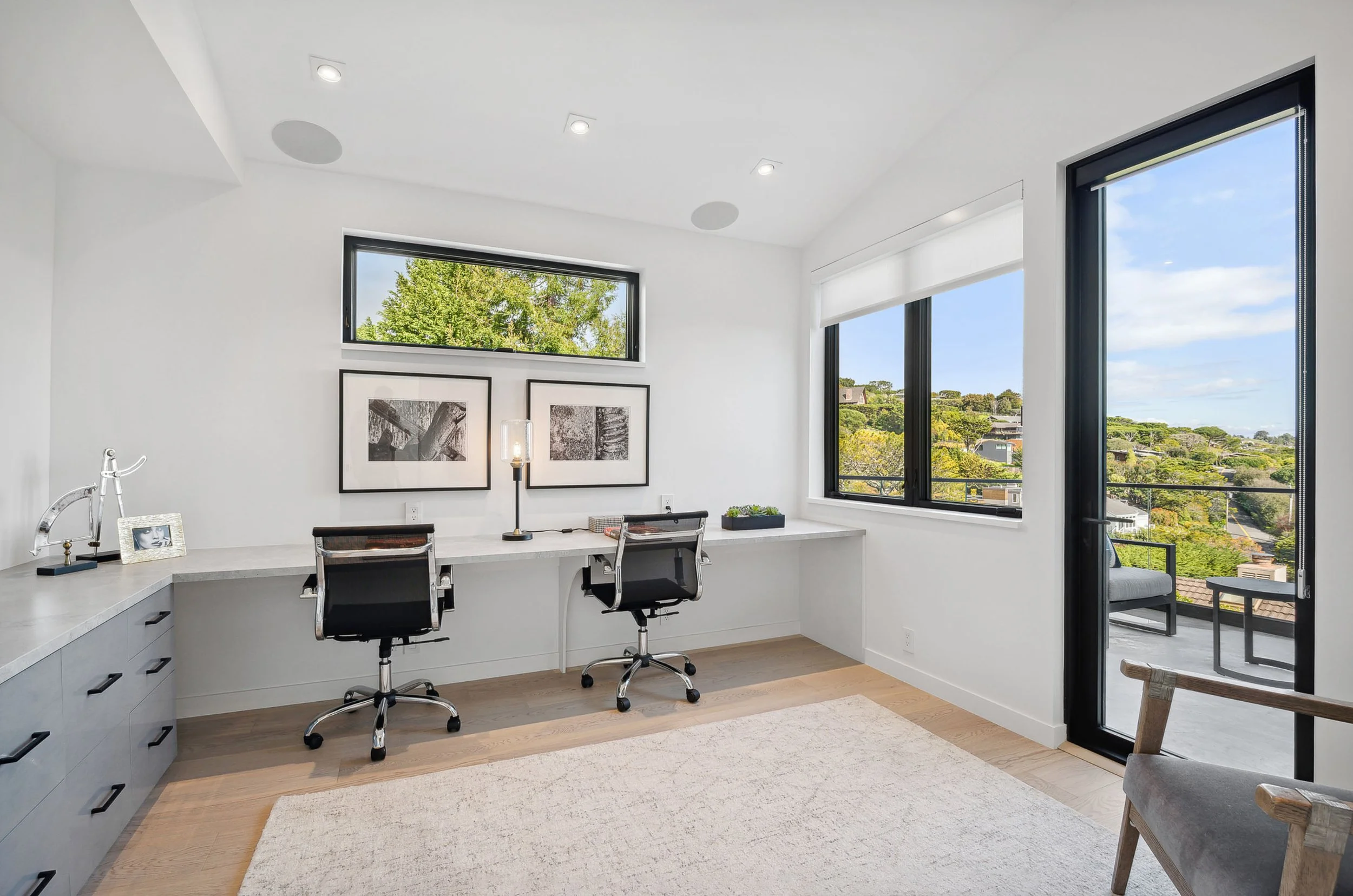This sleek modern home in Belvedere, CA features custom cabinetry throughout, Miremont Millwork designed and fabricated custom cabinetry in several rooms with premium materials and modern finishes. From the living room and office to a fully custom wine cellar, each space integrates clean lines, practical storage, and a strong visual identity.