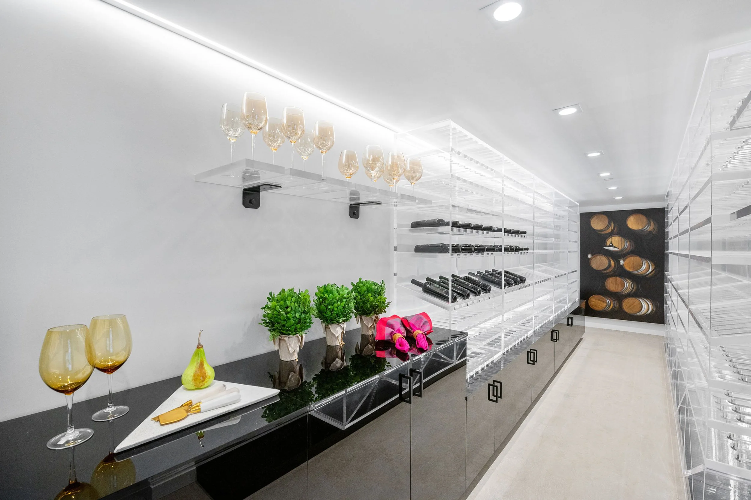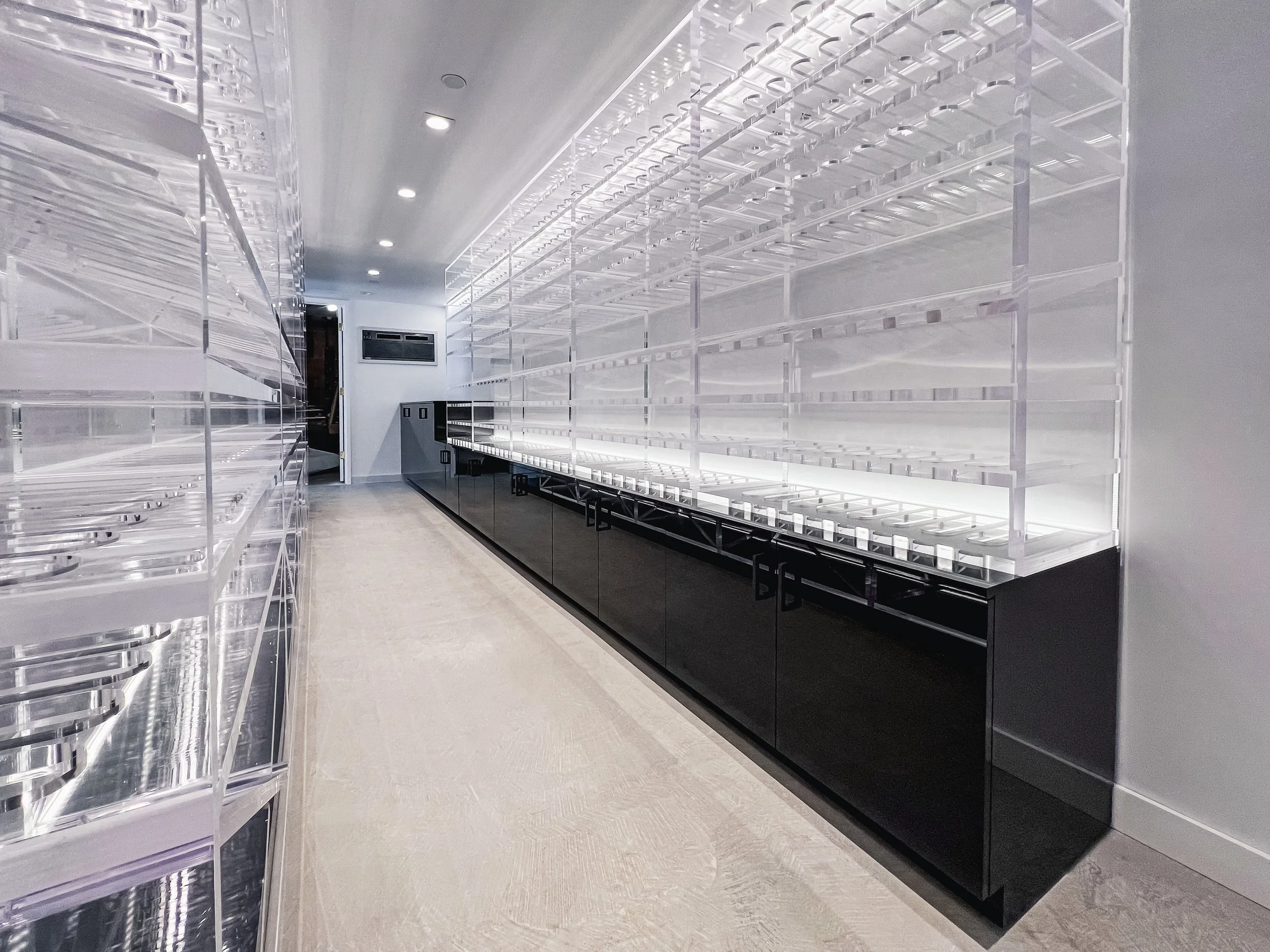 We fabricated a full wall of luxurious, clear acrylic wine racks, precision-machined and lit with wine-safe LED lighting to enhance clarity and drama without compromising storage conditions. Below, we installed a row of high-gloss black acrylic cabinets for backup storage and additional wine service functionality.