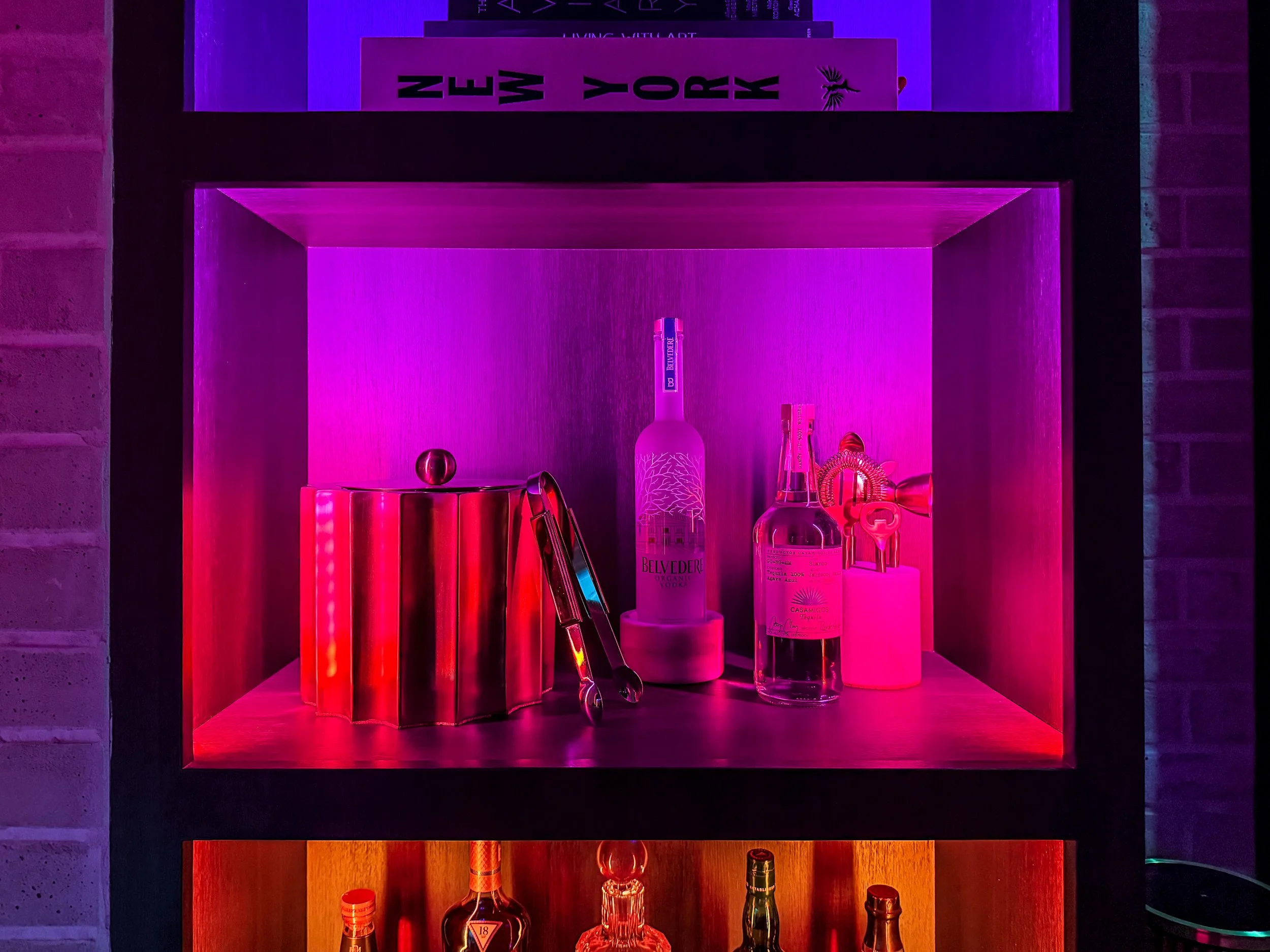 The built-in cabinetry system anchors the room with a combination of floating cabinets, integrated drawer banks, and LED-lit bookcases. All units are constructed from Baltic birch plywood and clad in Wilsonart’s Fairchild veneer for a warm, natural grain texture with a modern edge. Every cabinet and shelf includes soft-close Blum hardware and integrated color-changing LED lighting. The floating vanity wall supports a Corian-wrapped, lit mirror, while the main focal wall integrates drawer storage with shelving and dedicated spirits cabinets.