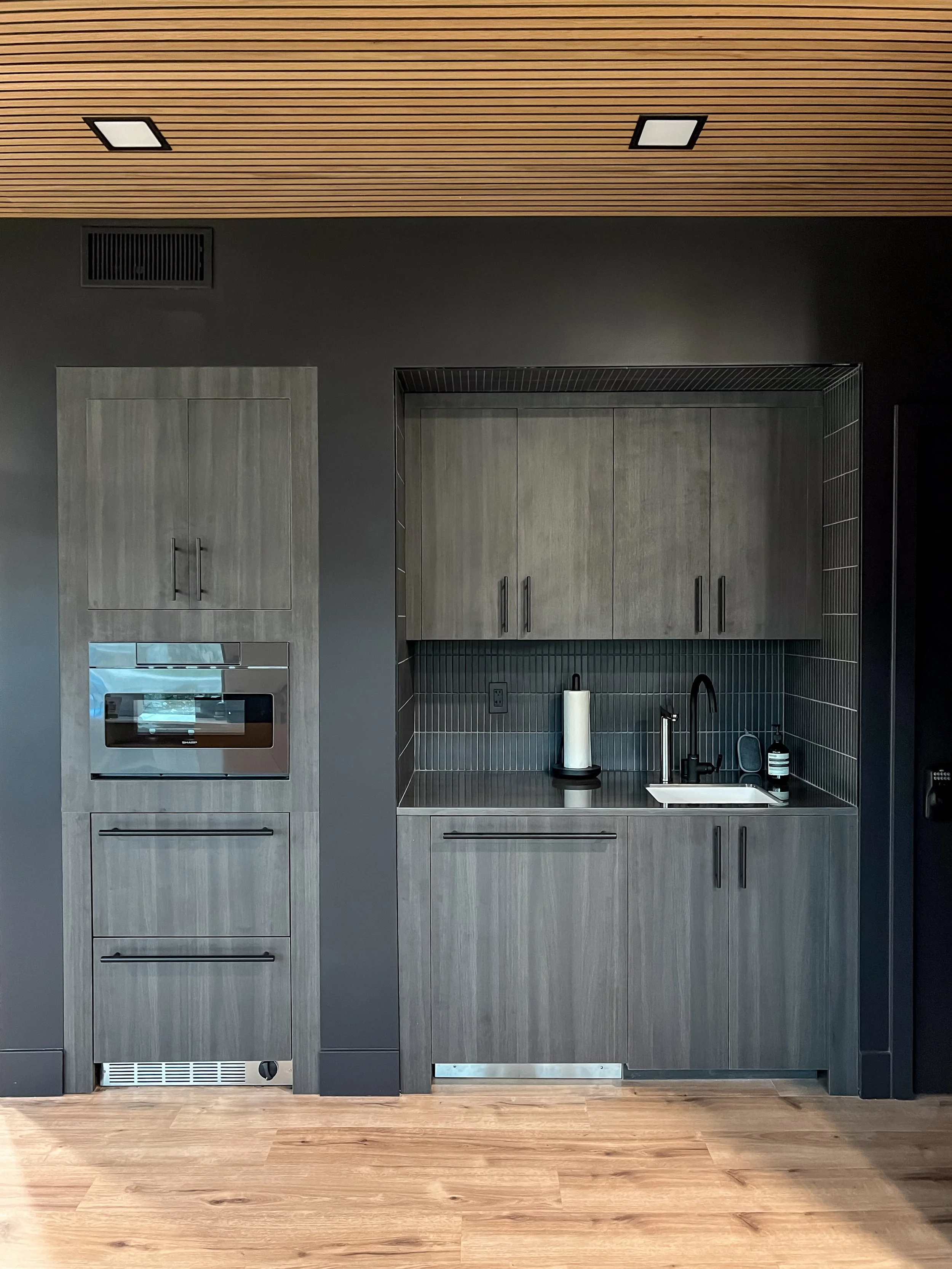 Cabinetry is finished in Wilsonart’s Fairchild textured veneer, chosen for its warm-gray linear grain and commercial durability. Thermador panel-ready appliances, including the refrigerator drawers and dishwasher, were clad in matching Fairchild panels to disappear into the cabinetry. The Sharp drawer microwave, while not panel-ready, is recessed cleanly into its own custom housing for a seamless built-in look.