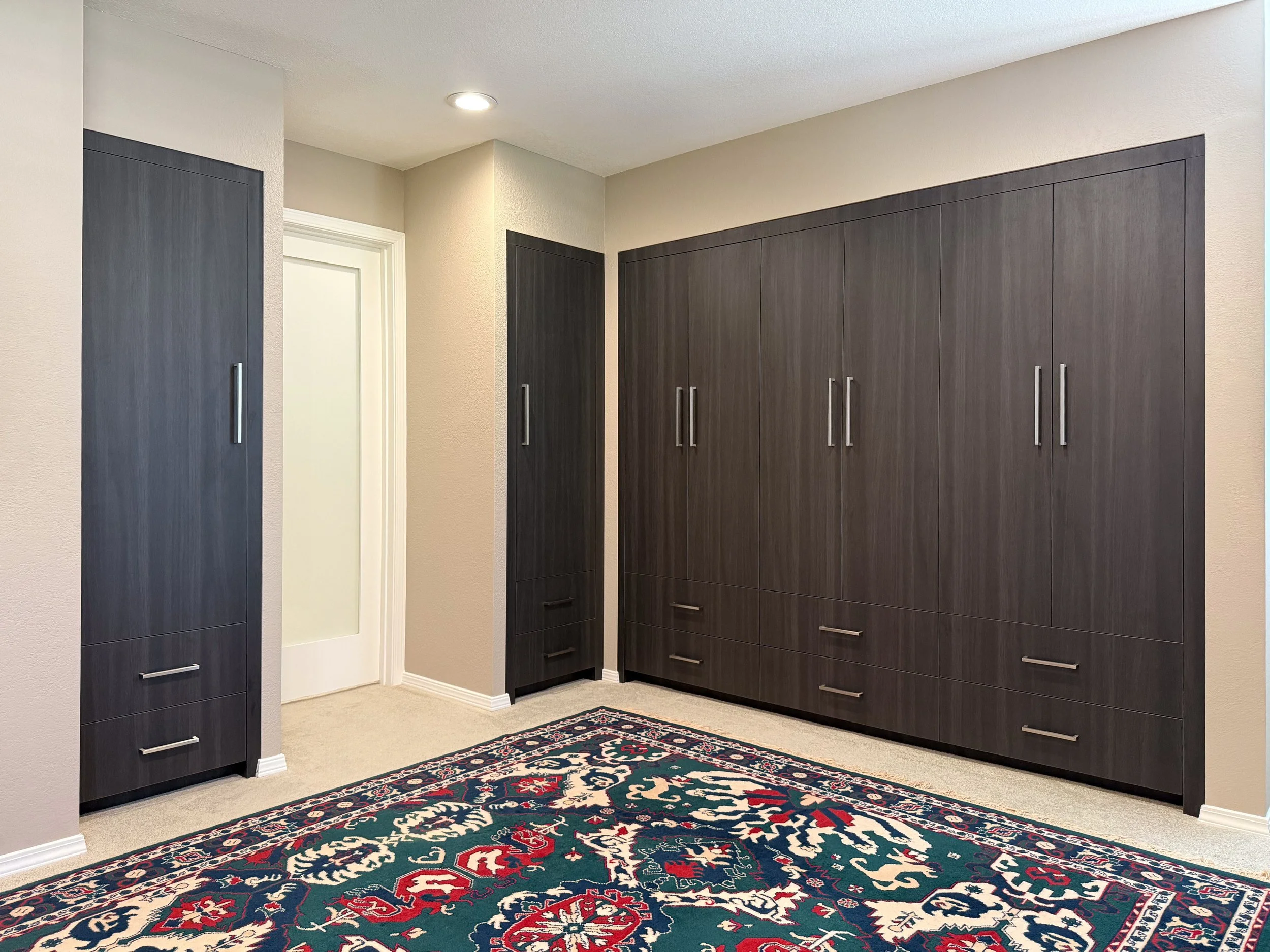 Miremont Millwork was commissioned to design, fabricate, and install custom built-in cabinetry for this modern townhouse located in Petaluma, CA. The scope included a complete millwork package for the primary bedroom and bathroom — including custom closet cabinetry, a floating vanity, full-height linen storage, and a seamless solid surface countertop solution.